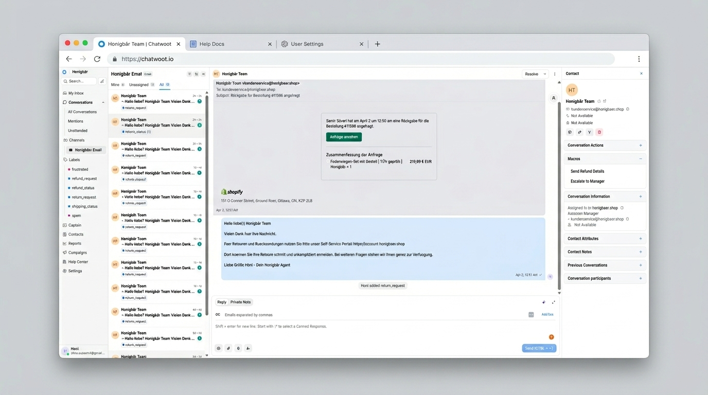 Der erste Automatisierungsschritt: Ein KI-Agent in Chatwoot liest eingehende E-Mails mit, erkennt die Retouren-Absicht und antwortet dem Endkunden automatisch mit einem freundlichen Hinweis auf das Shopify Self-Service-Portal.